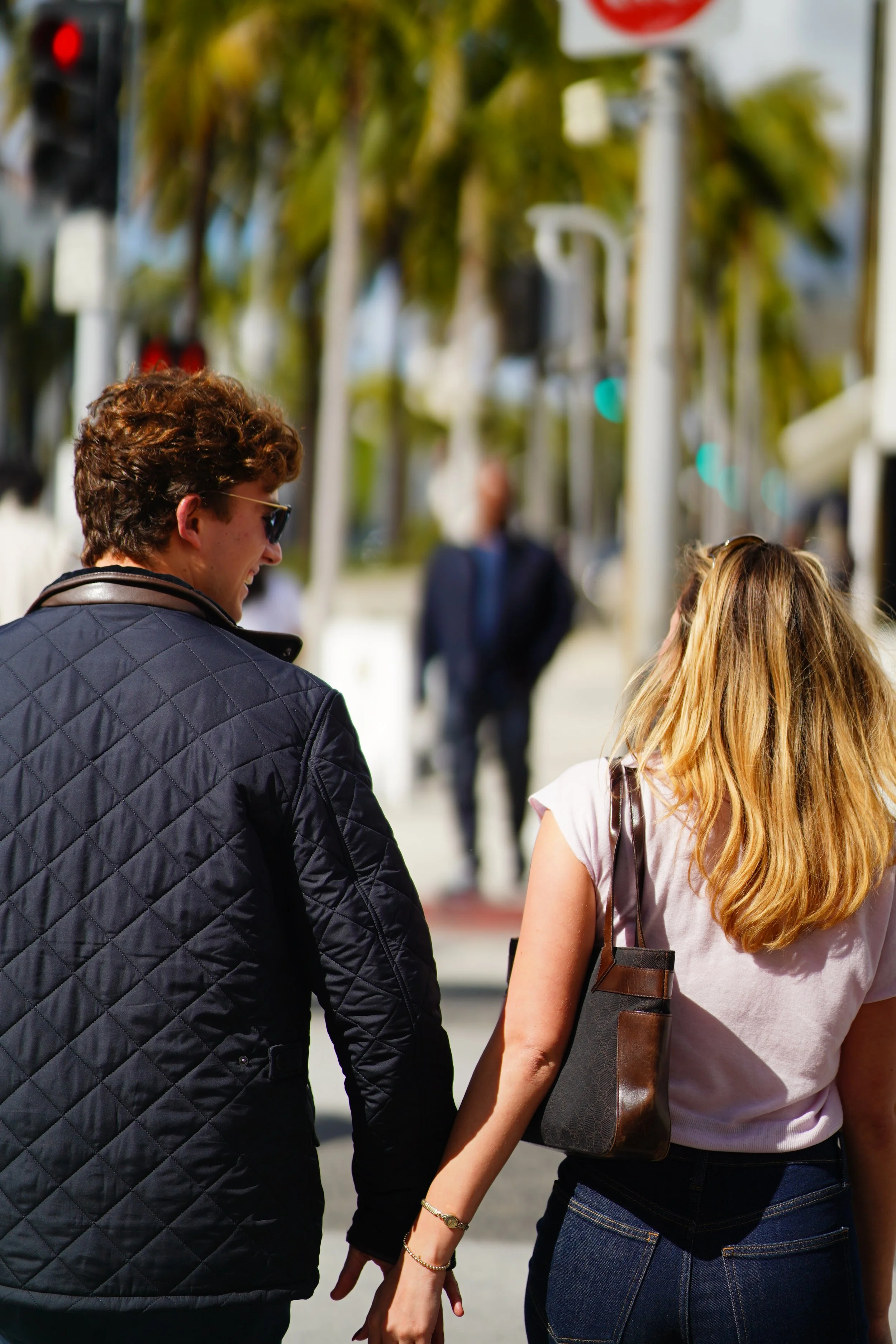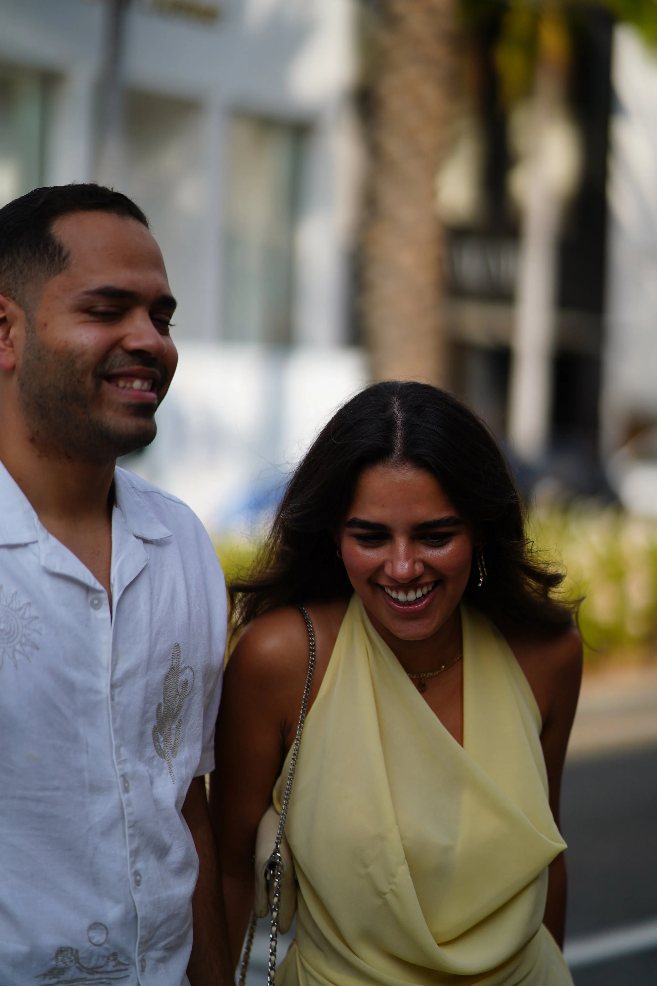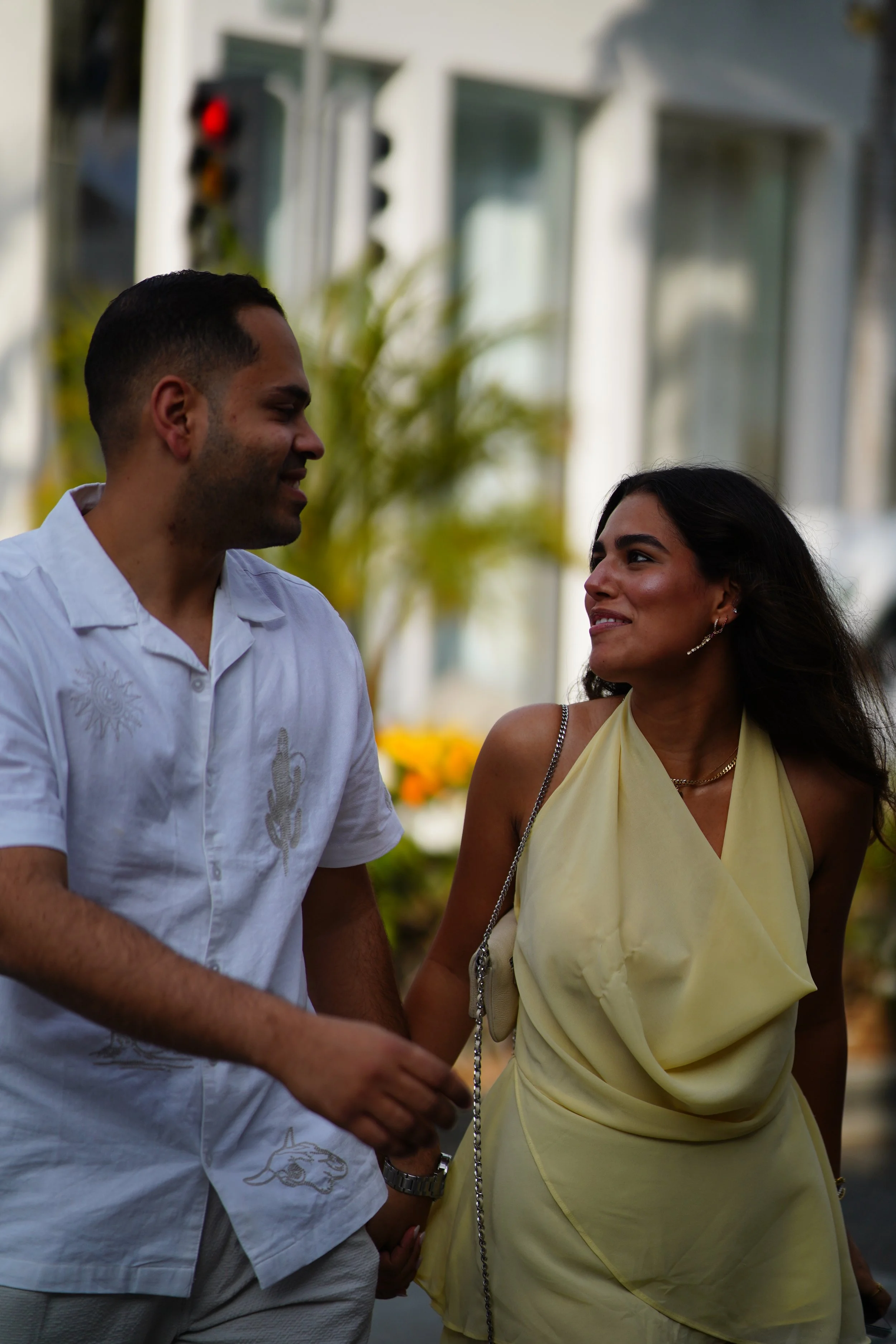 A couple standing close together on a city street, with the woman's arm around the man's neck
