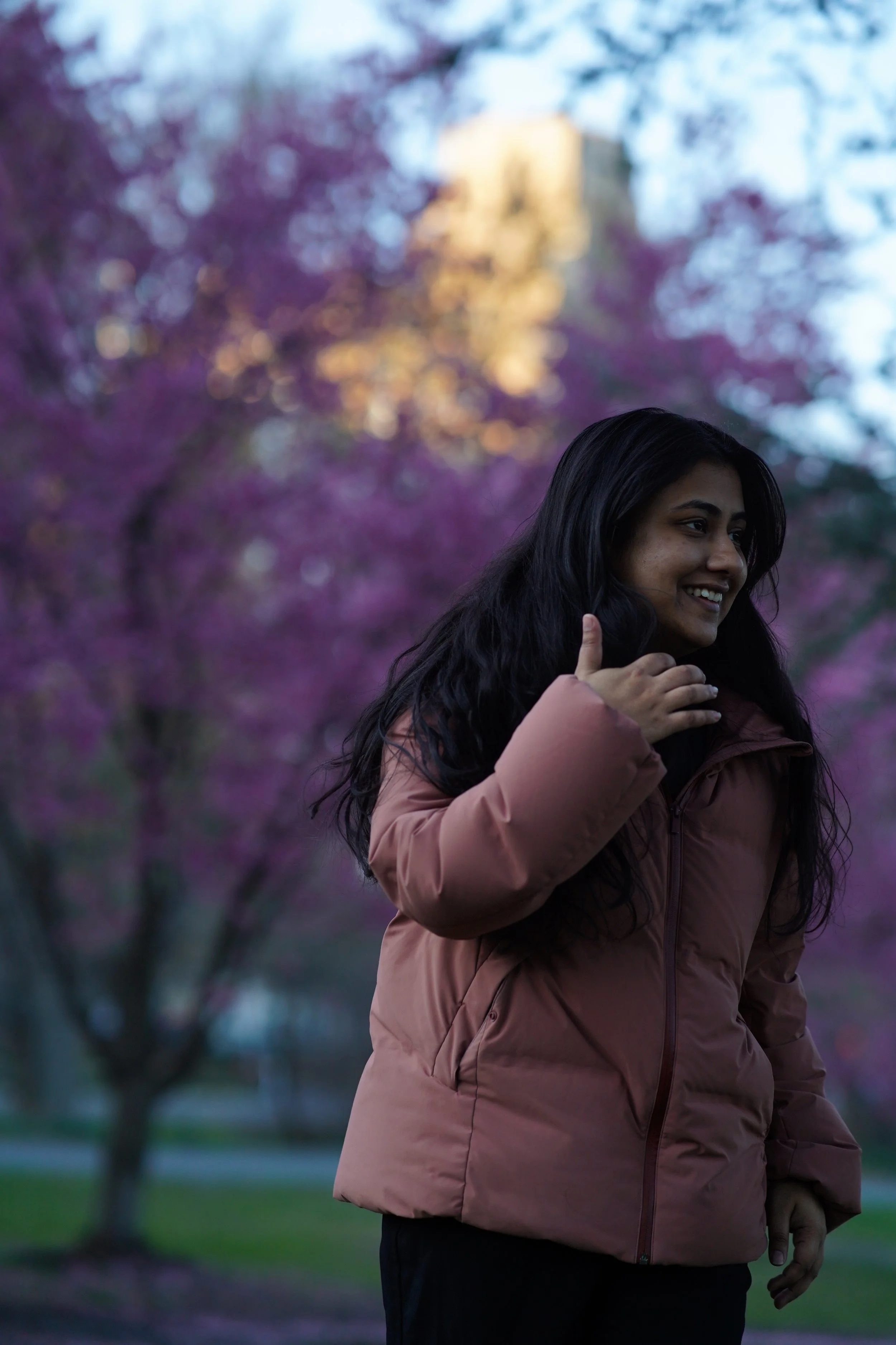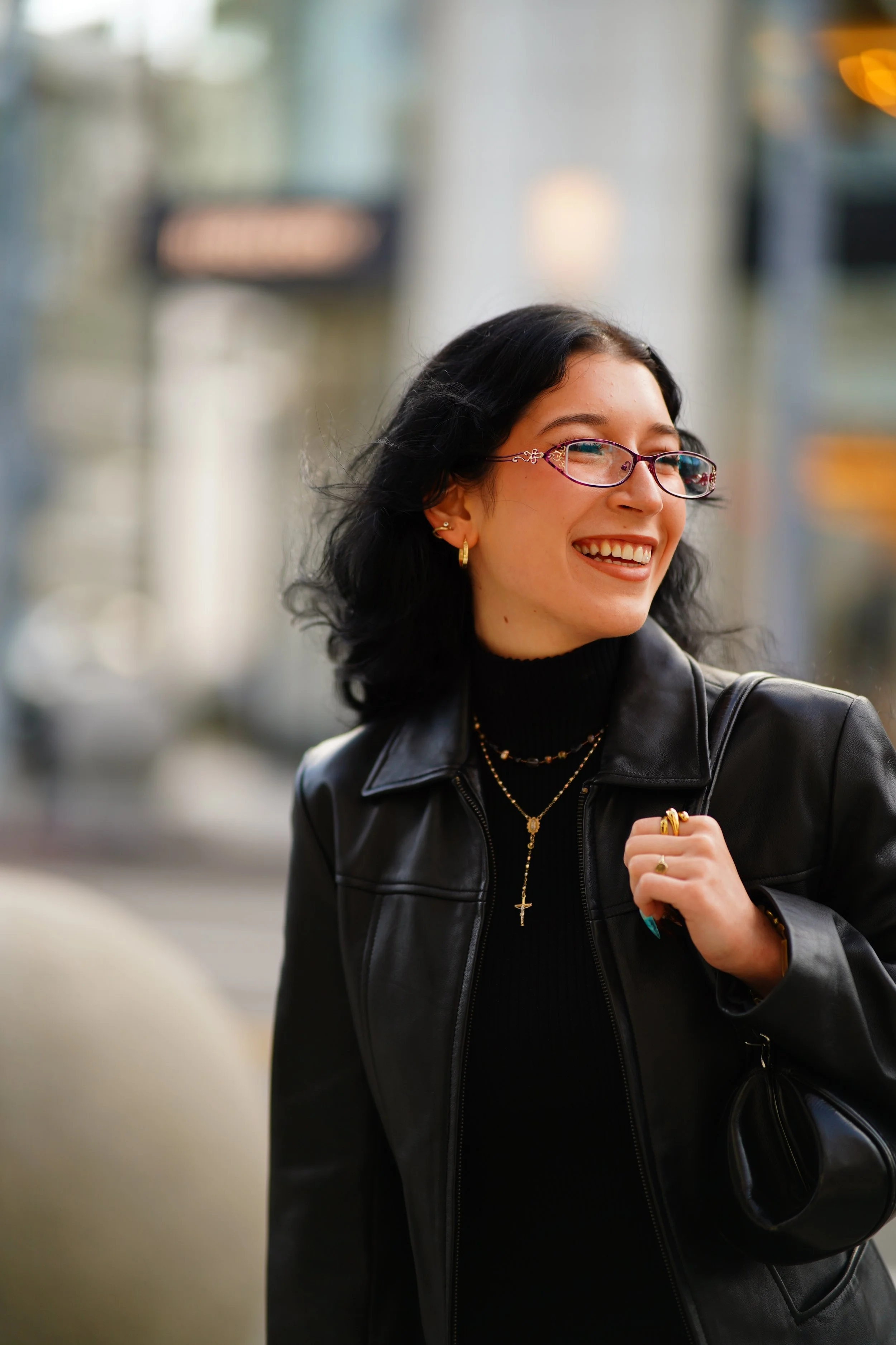A woman smiling with glasses, wearing a black leather jacket, layered necklaces, earrings, and rings, standing outdoors in an urban setting.
